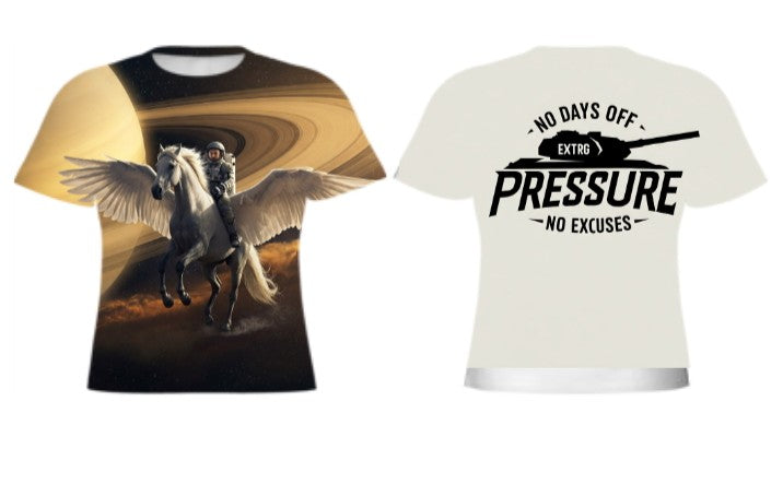 "Soar into style with this captivating t-shirt! This shirt features a vibrant, all-over print that transports you to a celestial realm. Imagine a figure in a spacesuit gracefully riding a magnificent winged horse against the breathtaking backdrop of a ringed planet and swirling cosmic clouds. The detailed imagery and rich colors make this a truly unique and eye-catching piece. Crafted from a comfortable fabric, this t-shirt is perfect for those who love fantasy, space, and making a statement with their wardrobe."