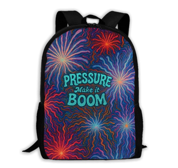 Hey there! Check out this vibrant backpack! It features a super cool and energetic design with bursts of colorful, wavy lines that look like fireworks exploding against a deep blue background. Right in the center, in a fun, teal-blue font, it says "PRESSURE Make it BOOM." It's definitely a backpack that will make a statement and add a pop of excitement to your day!