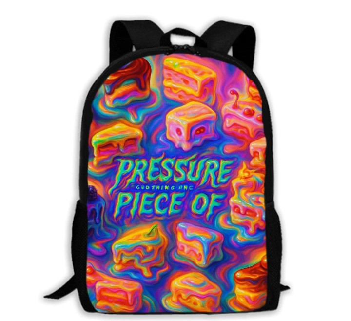 Hey there! Check out this eye-catching backpack! It features a really cool, almost psychedelic design with melting, colorful cube shapes that look like pieces of cake or candy. The colors are super vibrant and swirly, giving it a totally unique and trippy vibe.