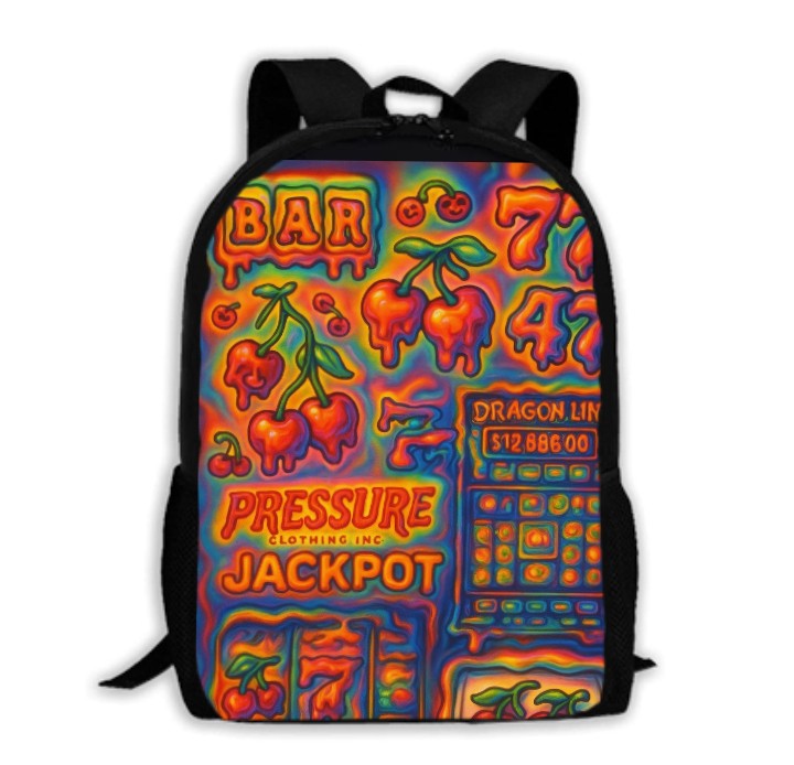 Hey there! Check out this eye-catching backpack! It's got a really vibrant and psychedelic design featuring melting slot machine symbols like cherries, "BAR," and lucky number 7s. You'll also spot the words "PRESSURE CLOTHING, INC." and "JACKPOT" in a cool, drippy font.