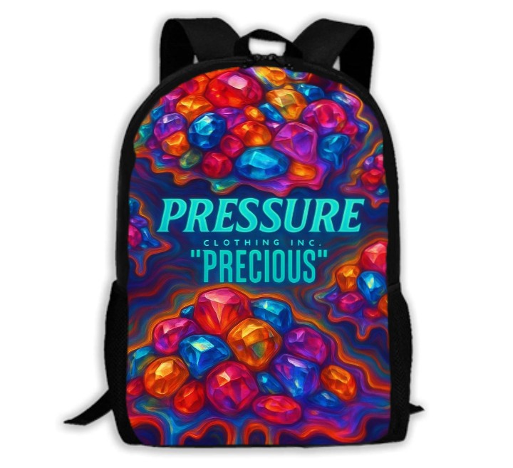 Hey there! Check out this vibrant backpack! It features a dazzling design of colorful, gem-like shapes that almost look like they're bubbling or melting together. The word "PRESSURE" is boldly printed across the middle in a cool, teal, slightly retro font, with "CLOTHING INC." written in smaller letters underneath. Below that, the word "PREcious" is featured in matching teal with quotation marks.