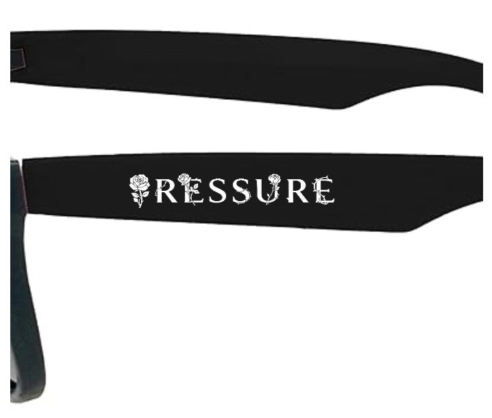 These wayfarer-style sunglasses have a black frame. The word 'PRESSURE' is printed in white on the right arm of the glasses, with floral designs incorporated into the letters.