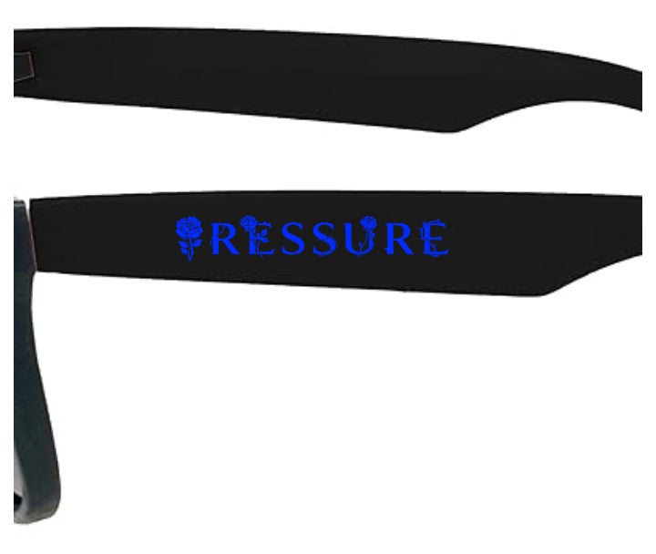These wayfarer sunglasses feature a classic black frame. The right arm is decorated with the word "PRESSURE" in a vibrant blue font, with subtle floral accents integrated into the design of each letter.