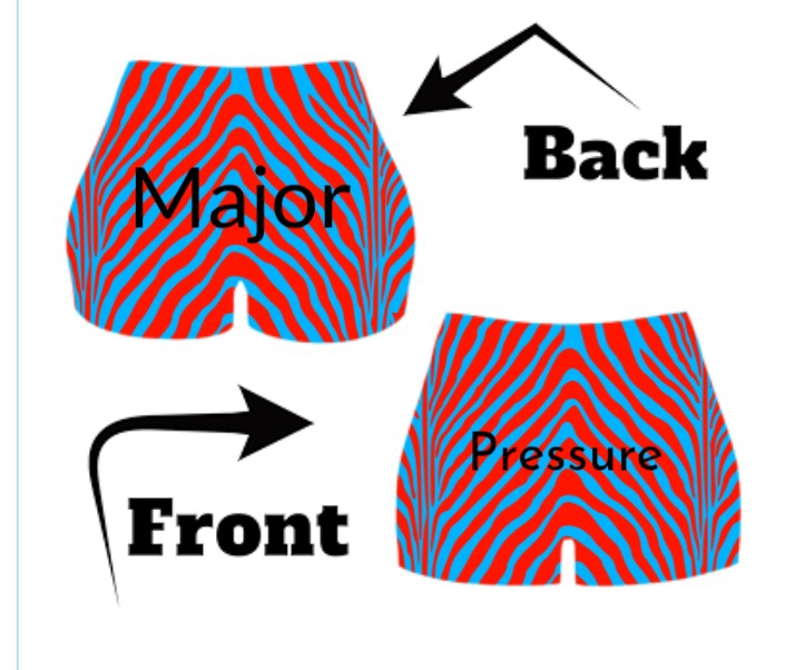 These are a pair of women's shorts with a vibrant red and light blue wavy stripe pattern covering them entirely. The image displays both the front and back of the shorts. The front view has the word "Pressure" printed on it, while the back view shows the word "Major". They seem to be a casual or athletic style due to their cut and the text featured.