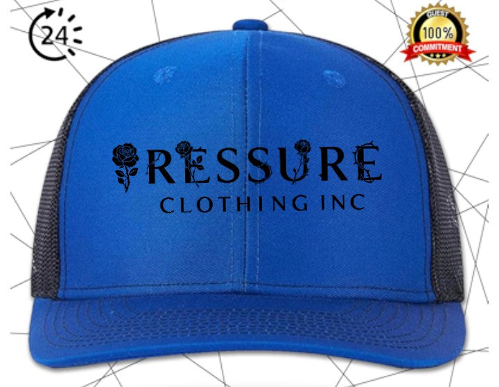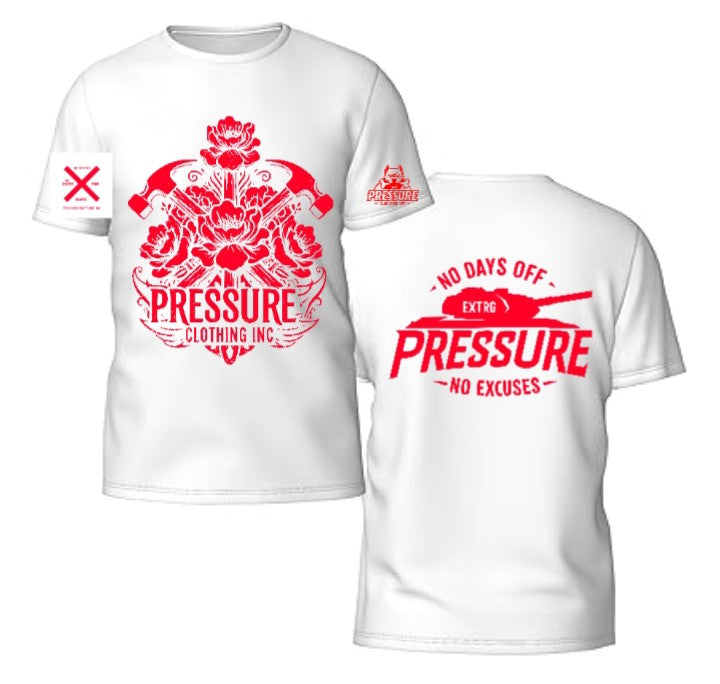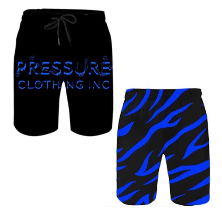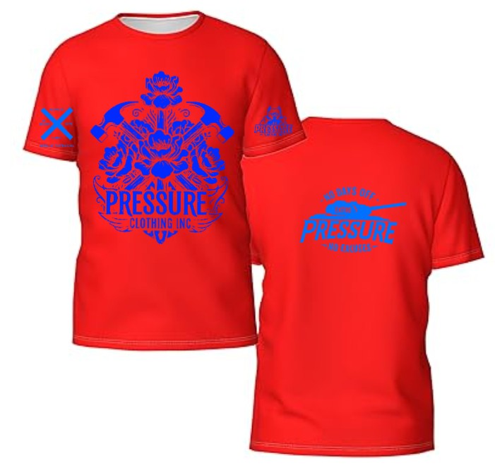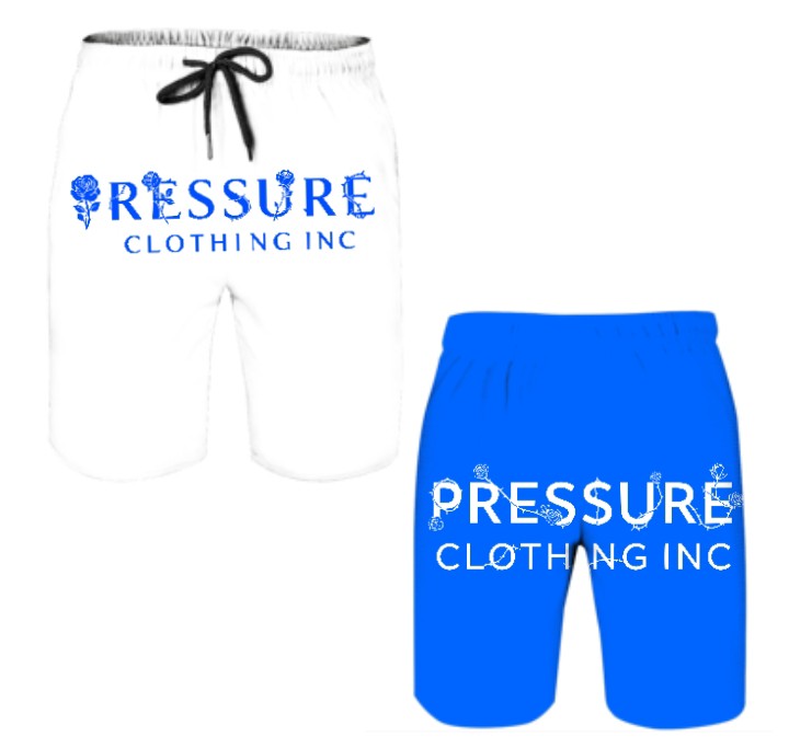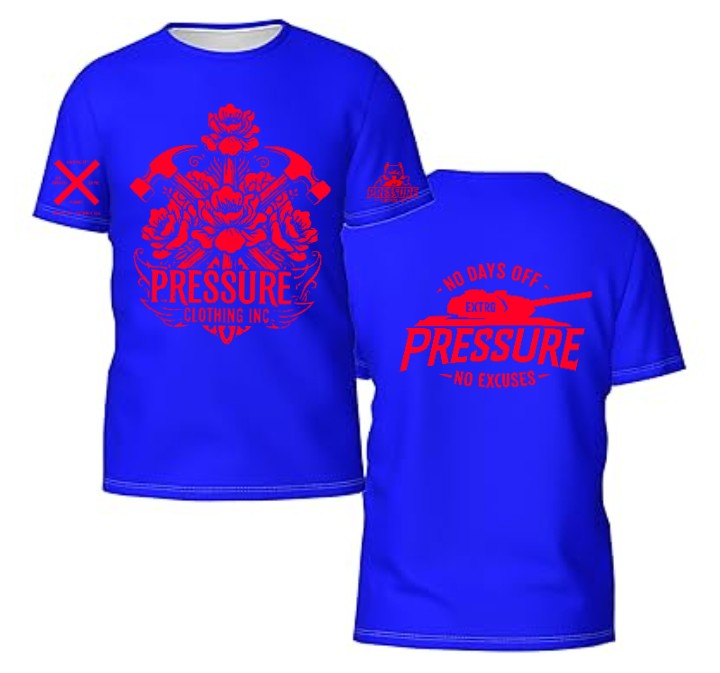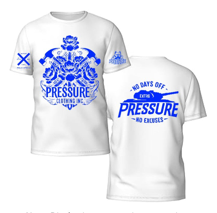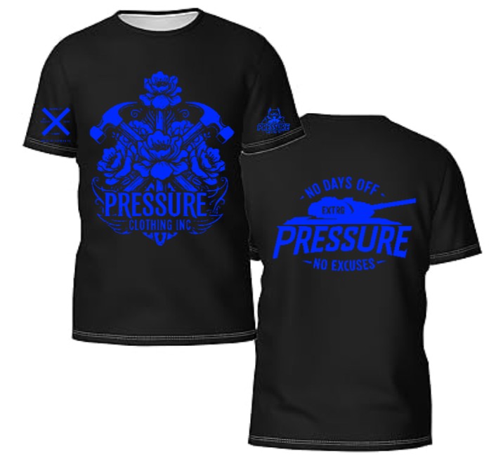 * Shirts: You'll find black, white, and royal blue t-shirts. Many feature the "PRESSURE" logo, some with additional text like "CLOTHING INC." or unique graphic designs. Some also have "Back" and "Front" indicated, suggesting different designs on either side.