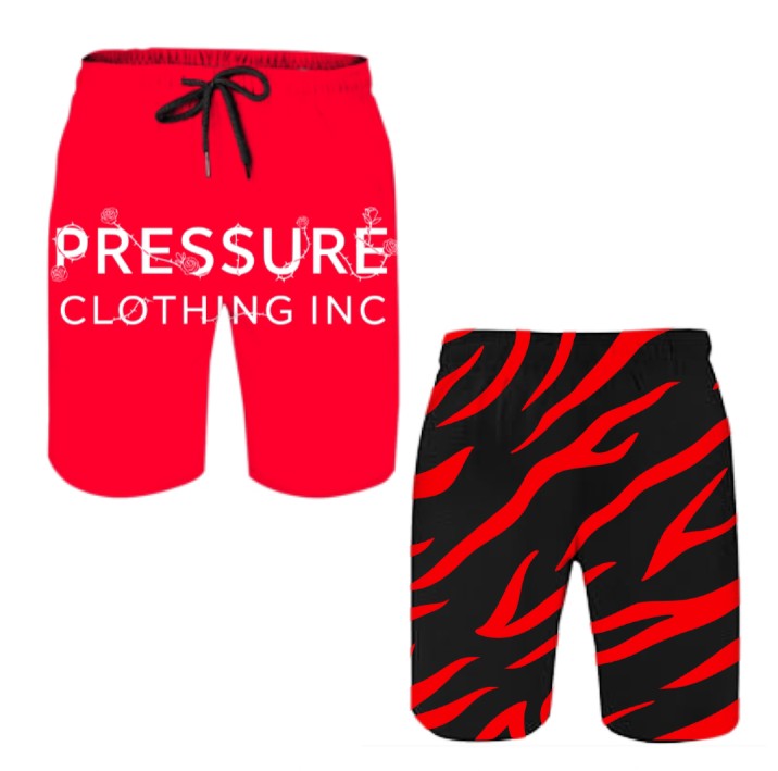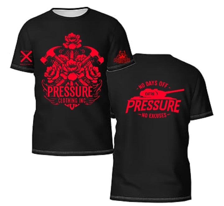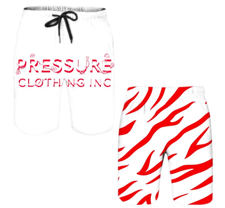 * Tops: Similar to the men's shirts, there are black, white, and red tops, featuring the "PRESSURE" logo and other coordinating graphics. Some images show the "Back" and "Front" of the tops.