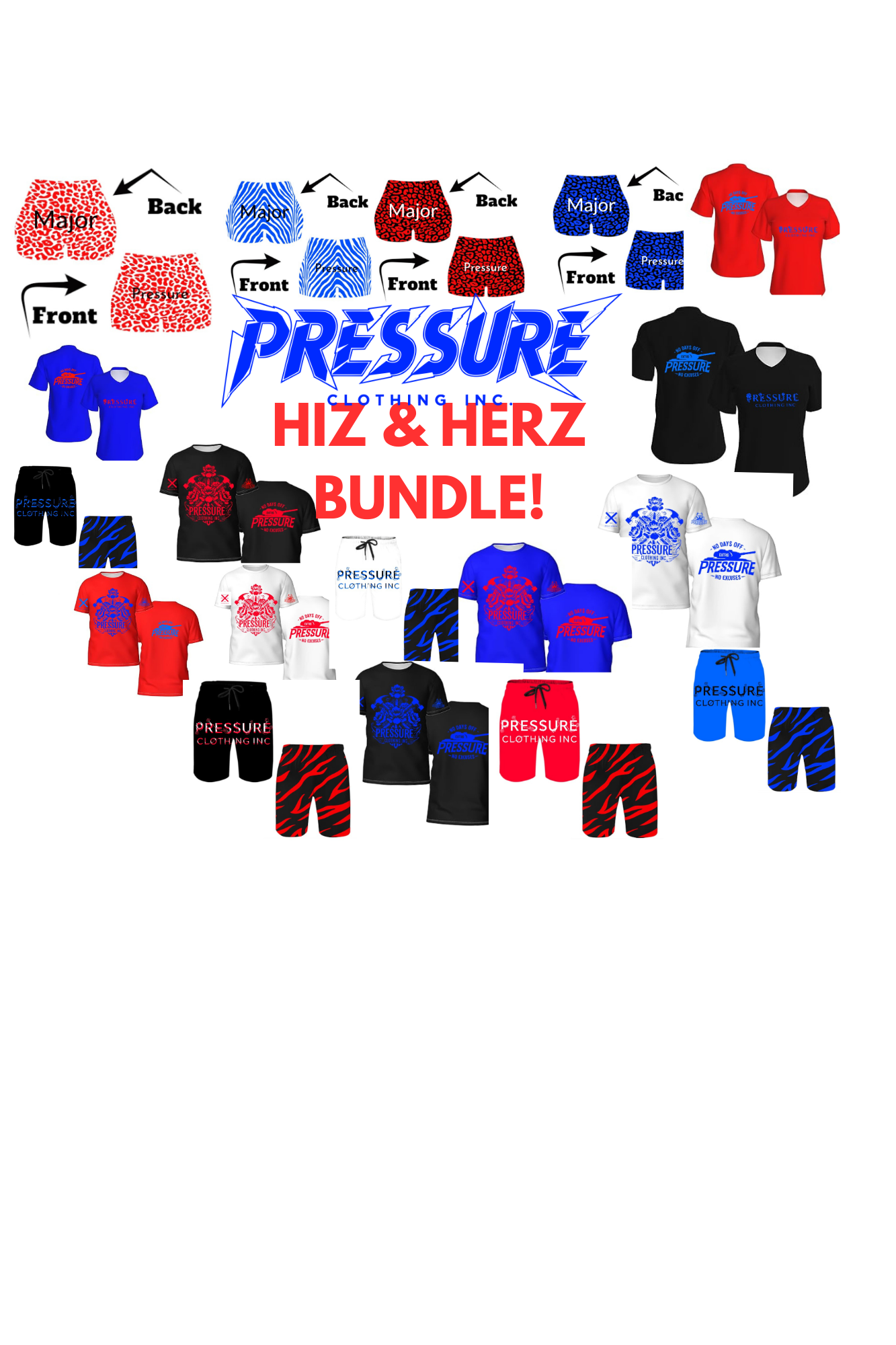 BUNDLZ FOR TH3 FAMMO Pick 2 mens & wmns shirts and two men's & wmns shorts plus four hats and two pair of SLIDZ This "Hiz & Herz Bundle!" from PRESSURE CLOTHING INC. offers a versatile collection of matching and complementary apparel for couples.