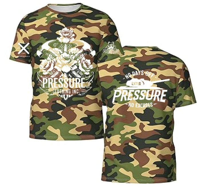 This eye-catching t-shirt features a full camouflage print in classic green, brown, and black tones, giving it a rugged and adventurous feel. On the front, a bold graphic stands out, showcasing stylized white and gold flowers intertwined with crossed axes. Above this design, the word "PRESSURE" is prominently displayed, followed by "CLOTHING INC." underneath. A smaller logo with what appears to be a stylized "X" is visible on the left sleeve.