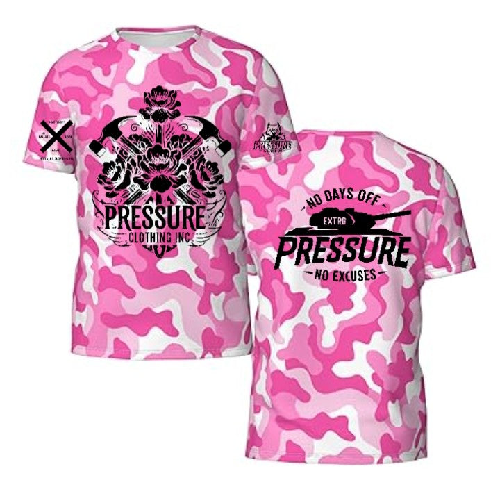 Turning to the back, the design continues with the camouflage pattern. Here, you'll see the word "PRESSURE" again, this time in a larger, more prominent black font, accompanied by the motto "-NO EXCUSES-" below it. Above "PRESSURE," there's a graphic of a tank and the text "NO DAYS OFF - EXTREME."