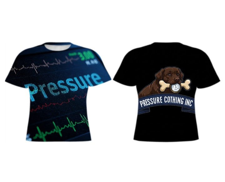 "This unique t-shirt features a striking design that's sure to turn heads! The front of the shirt showcases a bold graphic that mimics a vital signs monitor display. The word 'Pressure' is prominently featured in a bright blue, digital-style font, overlaid on wavy red and green lines that resemble an ECG or blood pressure readings. You'll even see some smaller white text and numbers in the corner, adding to the realistic monitor effect.