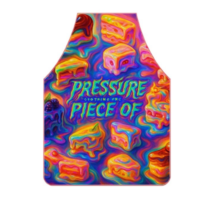 This apron features a fun and vibrant design with colorful, melting pieces of cake or ice cream. The text "PRESSURE CLOTHING INC. PIECE OF" is prominently displayed in a playful style. It's a unique and cheerful apron that would definitely add some personality to your cooking or crafting! Let me know if you have any other questions. š