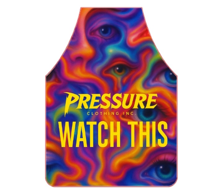 This apron features a vibrant and psychedelic design with swirling patterns in a range of colors. It includes the text "PRESSURE CLOTHING INC. WATCH THIS" in bold lettering. The overall design is artistic and eye-catching. Let me know if you have any other questions.
