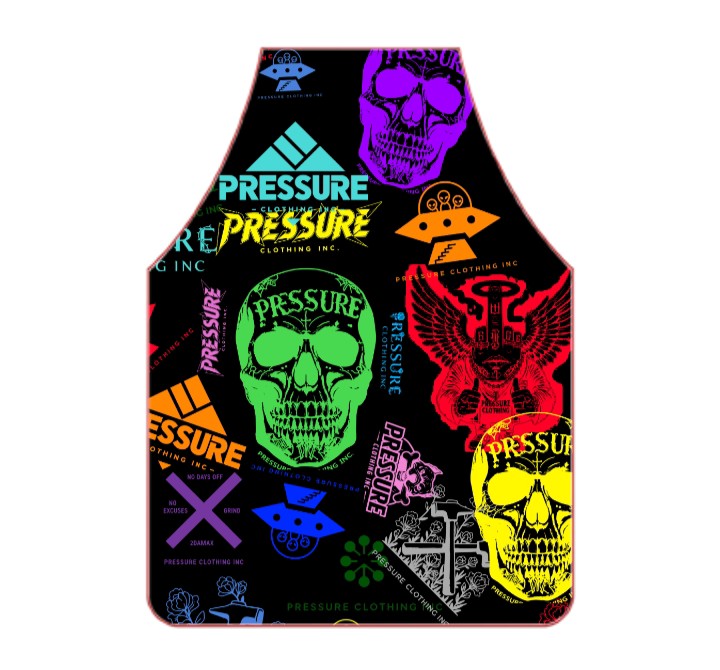 This apron has a bold and edgy design with a black background covered in vibrant graphics! You'll see colorful skulls in green, purple, red, and yellow, along with the word "PRESSURE CLOTHING INC." repeated in various styles and placements. There are also some other cool elements like a UFO and winged imagery, giving it a really unique and urban feel. It's definitely an apron for someone who likes to make a statement!
