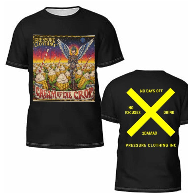 Hey there! Check out this cool black t-shirt. On the front, you've got a vibrant graphic with an angel-like figure standing above what looks like a field of frosted cupcakes or something similar. Above the figure, it says "PRESSURE CLOTHING" in small letters, and below the field, the words "CREAM OF THE CROP" are prominently displayed.