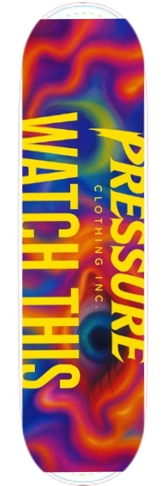 This skateboard deck features a captivating and vibrant design with a psychedelic, swirling background in shades of purple, blue, orange, and yellow. Dominating the design is a large, realistic eye centered vertically. To the left of the eye, in bold yellow text, the phrase "WATCH THIS" is written vertically. To the right, also in bold yellow text, "PRESSURE" is written vertically, with "CLOTHING INC." stacked horizontally beneath it. The overall look is dynamic and eye-catching, perfect for making a statement!