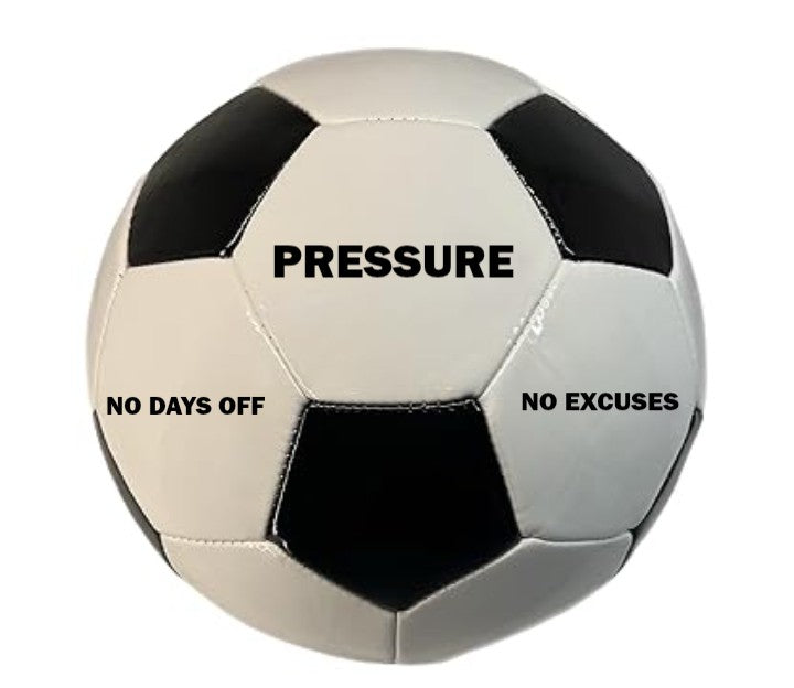 This is a classic black and white soccer ball, designed with motivational phrases for athletes. The central panel prominently features the word "PRESSURE" in bold, black letters. On either side, two other panels display "NO DAYS OFF" and "NO EXCUSES," reinforcing a theme of dedication and resilience. The ball appears to be a standard size and construction, with the familiar hexagonal and pentagonal panels stitched together. It's a great choice for someone looking for a soccer ball with an inspiring message.