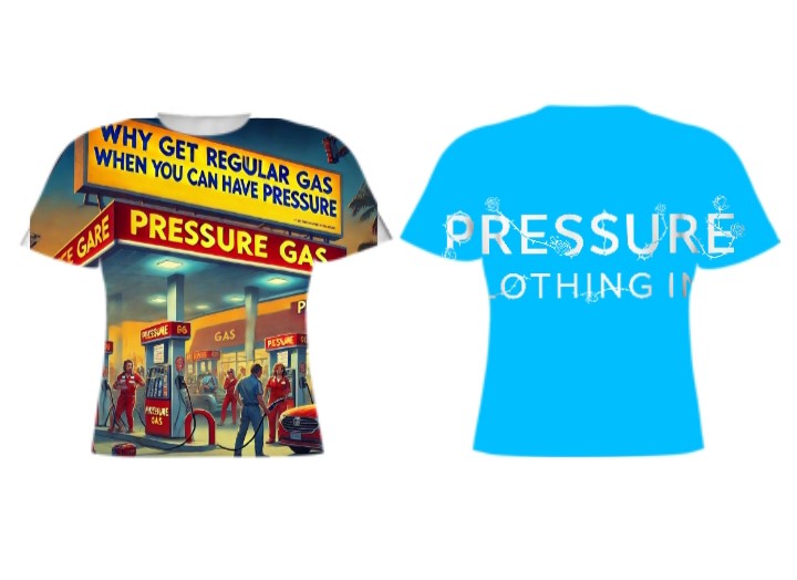 Check out this eye-catching t-shirt! The front of the shirt features a vibrant and retro-style illustration of a gas station called "Pressure Gas." The sign above the station playfully asks, "Why get regular gas when you can have pressure?" It's a fun and unique design that's sure to spark some conversations.