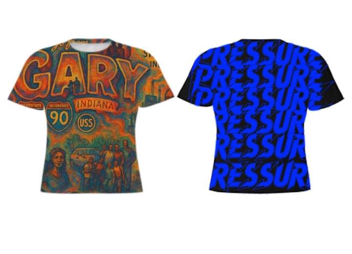 Then, flip it around, and you get a completely different vibe! The back is a bold statement with the word "PRESSURE" repeated in bright blue against a black background. It's a striking contrast to the front and adds a modern, edgy touch to the shirt.