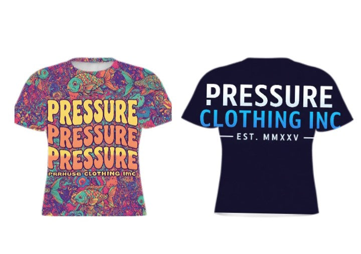 The shirt features a very colorful and psychedelic design on the front. It seems to depict an underwater scene with swirling patterns and cartoonish fish in vibrant shades of orange, teal, and pink. Overlaid on this busy background are the words "PRESSURE PRESSURE PRESSURE" stacked vertically in a bold, slightly bubbly yellow and orange font with a black outline. Below that, in a smaller, simpler orange font, it says "PRRHUSE CLOTHING Inc".