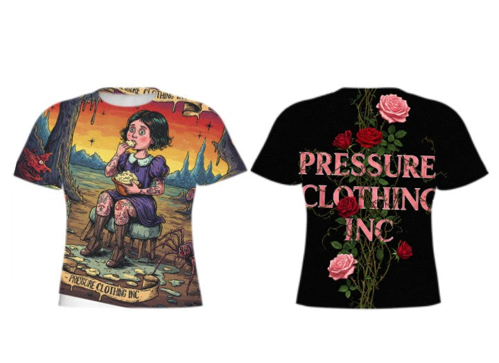 This unique t-shirt features a striking design on both sides. The front showcases a whimsical and slightly surreal illustration of a person sitting on a stool, seemingly enjoying a snack amidst an otherworldly landscape with interesting details. Flipping to the back, you'll find a bold graphic with the words "PRESSURE CLOTHING INC" in a textured pink font, intertwined with thorny vines and beautiful red and pink roses. It's a statement piece that combines artistic flair with a touch of edgy elegance.