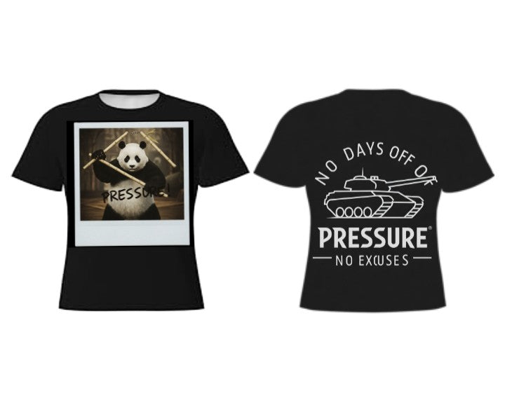 Check out this cool black t-shirt! On the front, it features a polaroid-style image of a panda holding bamboo sticks, looking ready for action. The word "PRESSURE" is printed in bold red letters across the bottom of the polaroid.