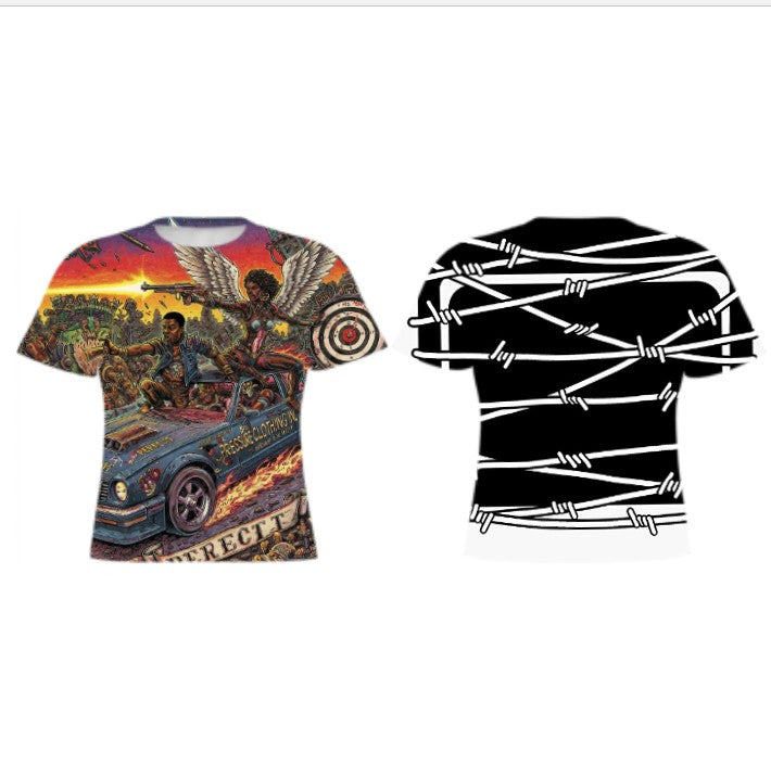 This shirt features a vibrant and detailed design that definitely has a retro vibe. On the front, you'll see a dynamic scene with a figure sporting large, feathered wings, appearing almost angelic, alongside another figure riding in a classic-looking blue car. The artwork has a slightly surreal and action-packed feel, with elements like a target symbol adding to the visual interest. There's also some text visible, possibly the brand or a slogan, which adds another layer to the design.