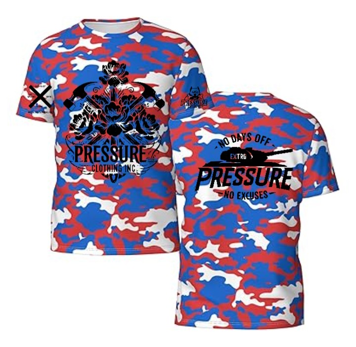 Turning to the back, the camouflage pattern continues. There's another black graphic, this time featuring a tank silhouette. Above the tank, it reads "NO DAYS OFF" and below it, again in a noticeable font, is "PRESSURE" with "NO EXCUSES" underneath in smaller text.
