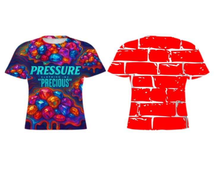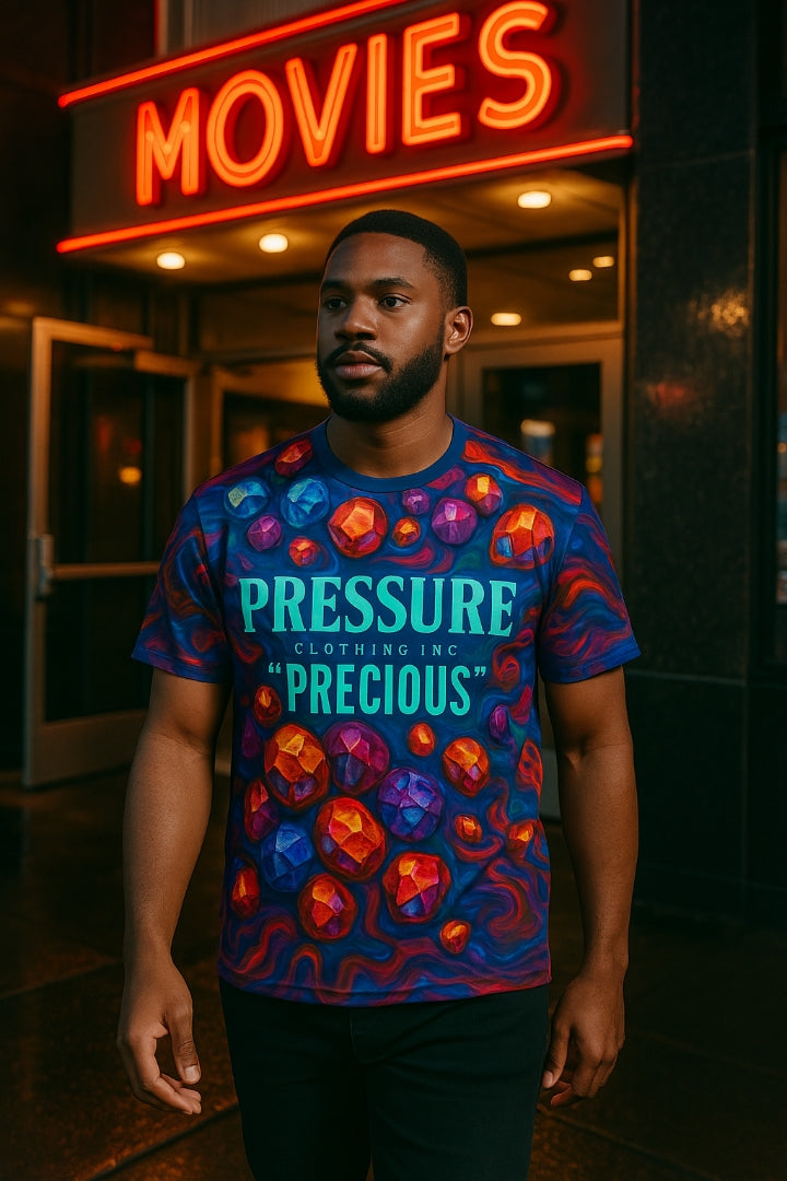The front of the shirt features a vibrant and eye-catching design. It's adorned with colorful gems or crystals in shades of blue, purple, red, and orange, seemingly scattered across the front and sleeves. These gems appear to be dripping or melting into a swirling, psychedelic background with wavy lines in shades of blue, purple, and pink. Overlaid on this design are the words "PRESSURE" in a bold, slightly stylized blue font, followed by "CLOTHING INC." in smaller, light blue lettering, and then the word "PREcious" in a cursive, light blue font enclosed in quotation marks. The overall impression is bold, artistic, and somewhat abstract.