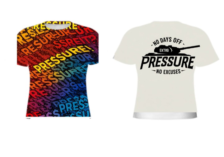 And the background isn't just plain either. It's got this cool, almost splattered dark texture that makes those bright "PRESSURE" words really pop. If you're looking for a shirt that's bold, colorful, and full of energy, this is definitely it! What do you think?