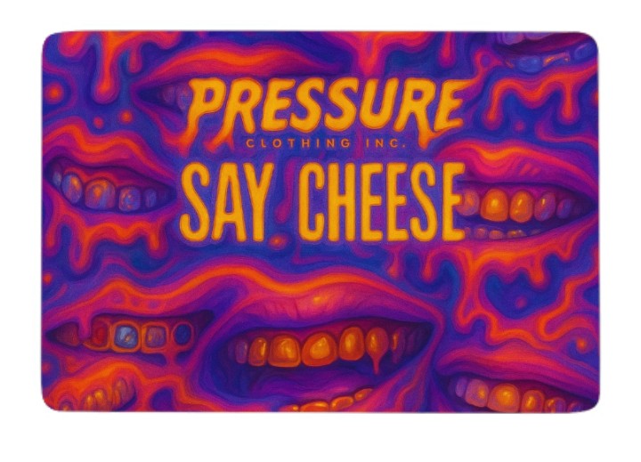 This 48x16 rug features a surreal and vibrant design. The background has a swirling, melting effect in shades of purple and blue, with accents of orange and yellow. Several sets of stylized lips with teeth are incorporated into the design, giving it a slightly psychedelic feel. In the center, the words "PRESSURE CLOTHING INC." are stacked above "SAY CHEESE" in a bold, dripping yellow font. This rug is definitely a unique and eye-catching piece!