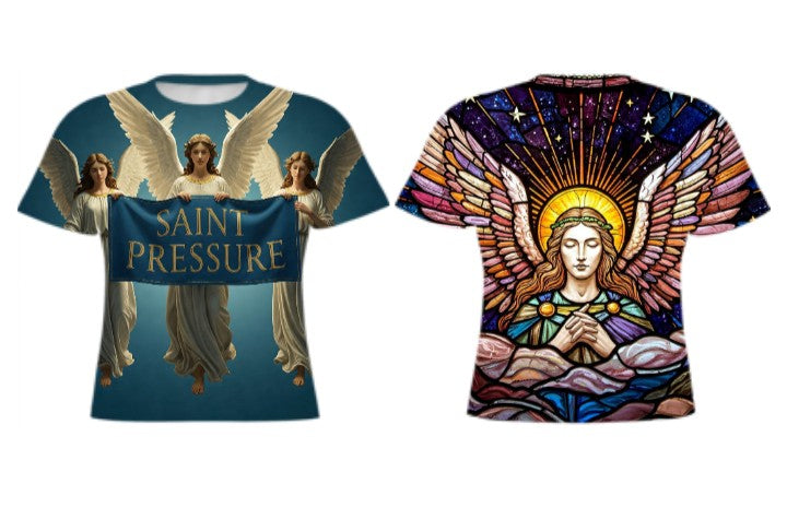 The front of the shirt features a digitally printed design with three ethereal angels. The central angel stands prominently, holding a dark blue banner with the words "SAINT PRESSURE" written in bold, gold lettering. The angels have large, feathered white wings and are depicted wearing flowing white robes. They appear to be standing on a cloud-like surface against a teal blue background.