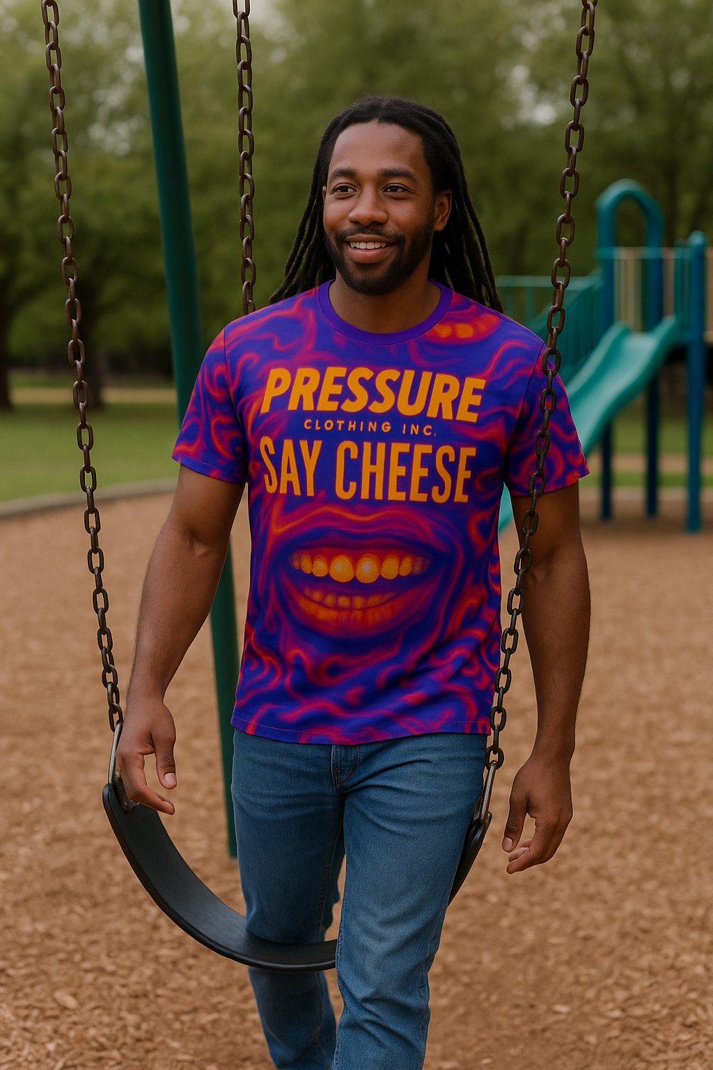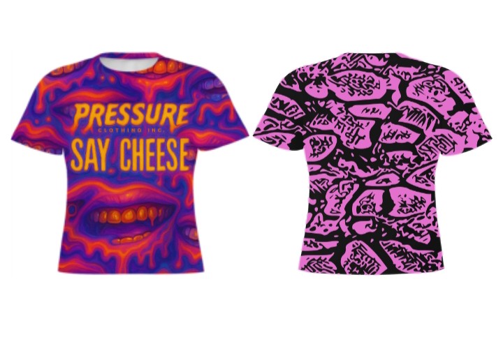 That's a wild shirt! The front is a vibrant, almost psychedelic design in shades of purple, orange, and red. It looks like a distorted, melting face with a prominent set of teeth. Above the mouth, in bold orange lettering, it says "PRESSURE" on the top line and "SAY CHEESE" on the line below. There's also some smaller text underneath "PRESSURE" that looks like "CLOTHING INC.".