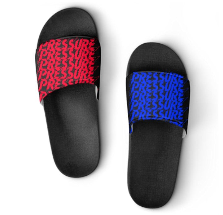 What makes them stand out is the repeated "PRESSURE" text printed across the straps. One flip-flop has the word "PRESSURE" in a vibrant red stacked multiple times, while the other features the same text in a striking blue. This contrasting color scheme adds a dynamic and energetic feel to the footwear. They look like a comfortable and casual option with a strong, graphic statement.