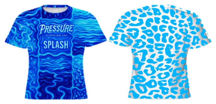 Check out this vibrant t-shirt! The front explodes with a dynamic blue design featuring swirling, watery patterns in varying shades. Bold white lettering announces "PRESSURE CLOTHING INC." stacked above a larger, stylized "SPLASH," giving it a cool, energetic vibe. Flipping it around, the back showcases a playful, all-over leopard print in a striking light blue on a white background. It's a unique piece that's sure to turn heads with its contrasting front and back designs!