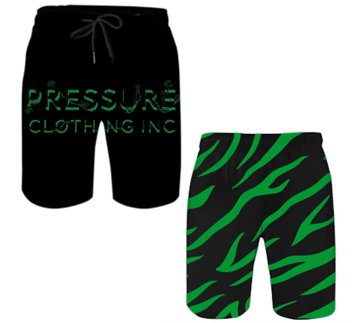 On the left, we feature a sleek black pair emblazoned with "PRESSURE CLOTHING INC" in a vibrant green, making a bold statement whether you're poolside or catching waves.