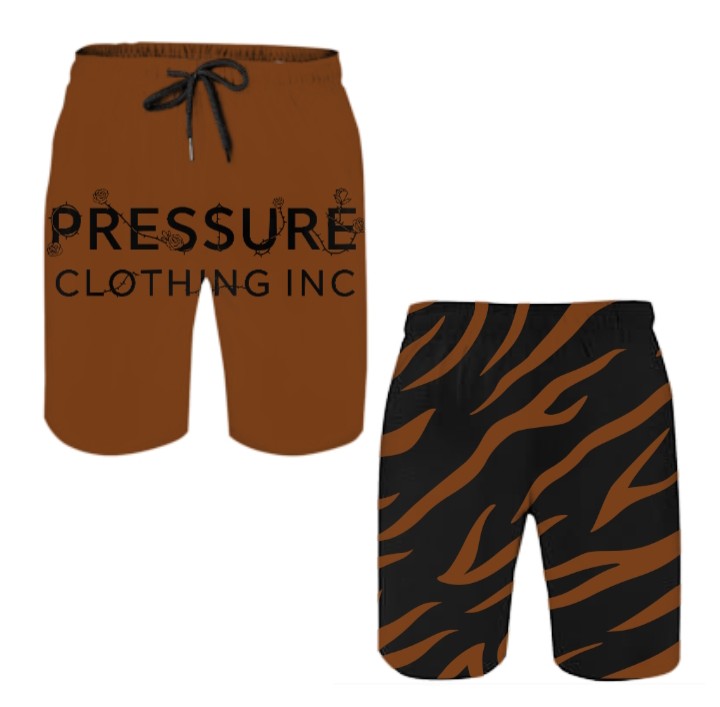 This is a stylish pair of swim trunks featuring a bold, all-over tiger stripe pattern in black and a warm brown. They appear to be a comfortable length, hitting around mid-thigh. They have a drawstring waistband for an adjustable fit, perfect for a day at the beach or lounging by the pool. These shorts are sure to make a statement!