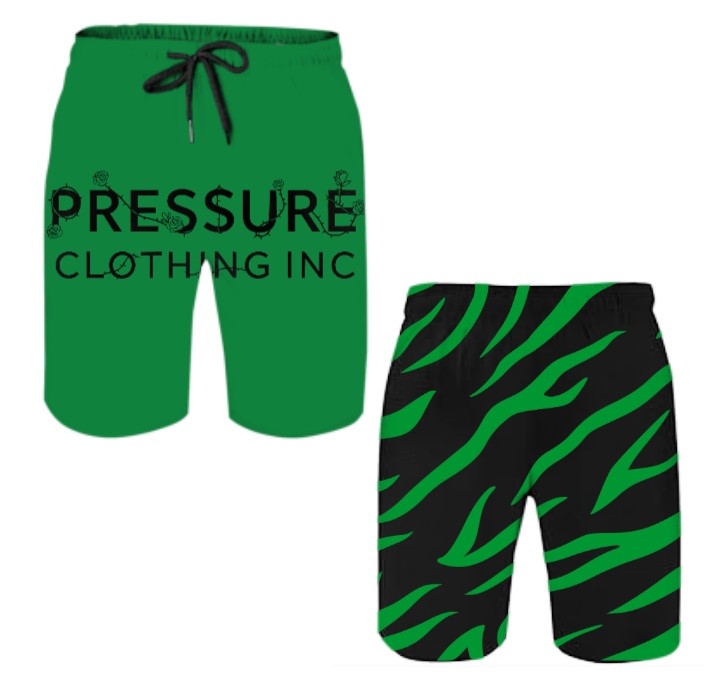 Make a statement with these vibrant green athletic shorts. Featuring a comfortable drawstring waist and a striking black "PRESSURE CLOTHING INC" graphic, these shorts offer a bold and energetic look for workouts or casual wear.