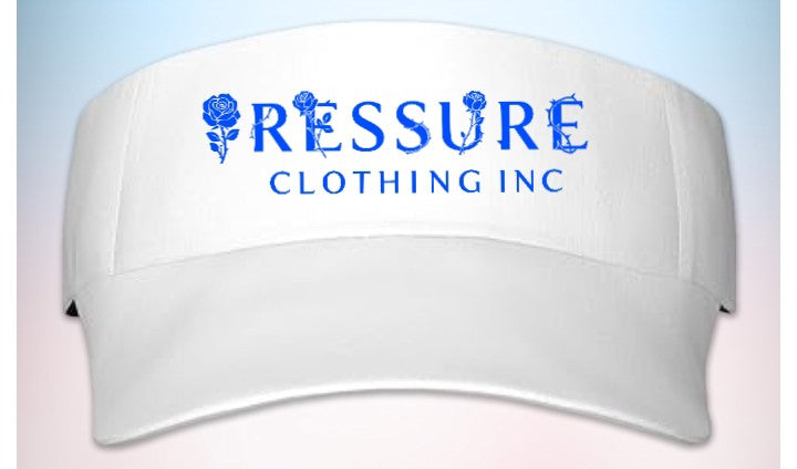 Hey there! Check out this cool white visor. It's got a really unique blue design on the front that spells out "PRESSURE" with some artistic flair – the 'P' looks like it's intertwined with a rose, and the 'R' and 'E' have some thorny vine details. Right underneath that, in a clean, simple blue font, it says "CLOTHING INC". It's a stylish way to keep the sun out of your eyes while making a statement!
