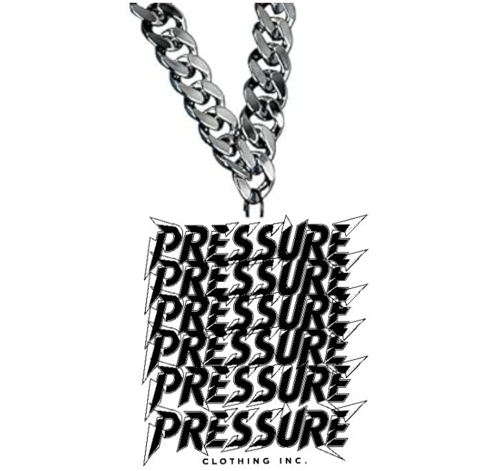 This is a bold and eye-catching pendant necklace. It features a chunky, silver-toned chain that gives it a substantial feel. The pendant itself is a rectangular tag with the word "PRESSURE" stacked multiple times in a dynamic, slightly jagged black font. Below that, in smaller letters, it says "CLOTHING INC." It's a statement piece that's sure to add some urban edge to any outfit! Let me know if you have any other questions. š