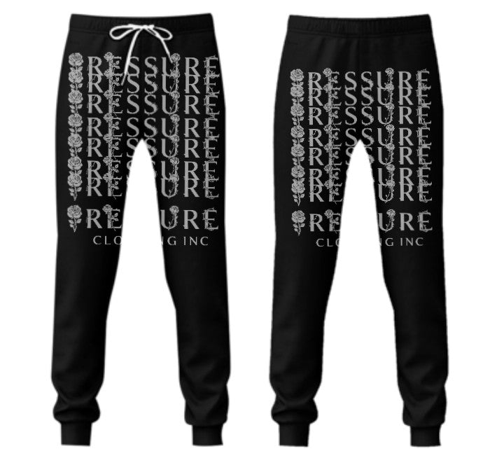 The sweatpants continue this theme with repeating vertical text that reads "PRESSURE" interspersed with rose and thorn illustrations down both legs. The "CLOTHING INC." text is subtly placed near the waistband. The pants appear to have a comfortable drawstring waist.