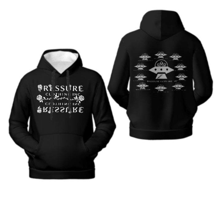 The hoodie displays the text "PRESSURE CLOTHING INC." prominently on the front, flanked by stylized roses and thorns. Below this, the word "PRESSURE" is mirrored, adding a unique visual element. The back of the hoodie is adorned with a playful arrangement of pixelated UFOs, with one larger, central UFO taking the spotlight. The overall aesthetic is edgy and streetwear-inspired.