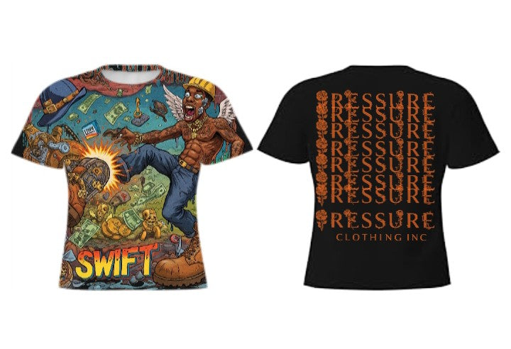 Check out this eye-catching t-shirt! The front of this vibrant shirt features a detailed and dynamic cartoon illustration. It looks like a chaotic scene with a central character kicking open a treasure chest overflowing with cash, jewelry, and other goodies. There are teddy bears, a hard hat, and even a winged figure in the mix, all set against a swirling backdrop. The word "SWIFT" is boldly displayed at the bottom.