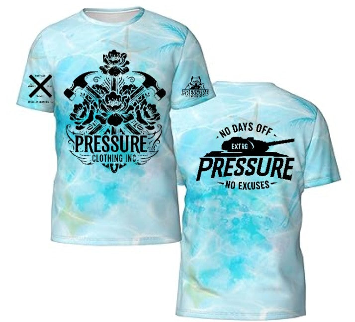 This eye-catching t-shirt features a vibrant, tie-dye-inspired pattern in shades of light blue and white, giving it a cool, beachy vibe. On the front, a bold black graphic commands attention. It showcases a stylized design with crossed hammers, roses, and intricate scrollwork, all surrounding the word "PRESSURE" in a strong, slightly distressed font, along with "CLOTHING INC." beneath it.