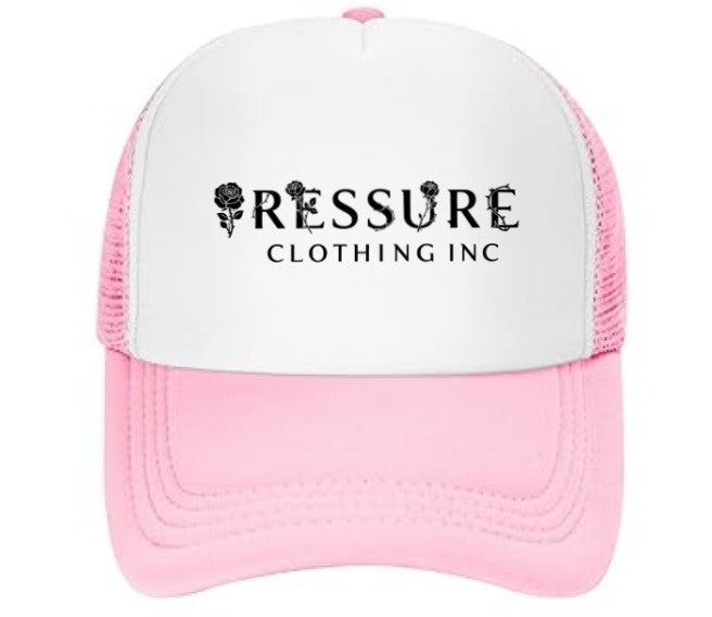 Hey there! Check out this cool trucker-style hat. It features a crisp white front panel, perfect for making a statement with the bold black "PRESSURE CLOTHING INC" logo right across the center, flanked by stylized rose graphics. The rest of the hat, including the breathable mesh back and the curved brim, comes in a soft, pretty pink. It's a stylish way to add a bit of edge and color to your look!