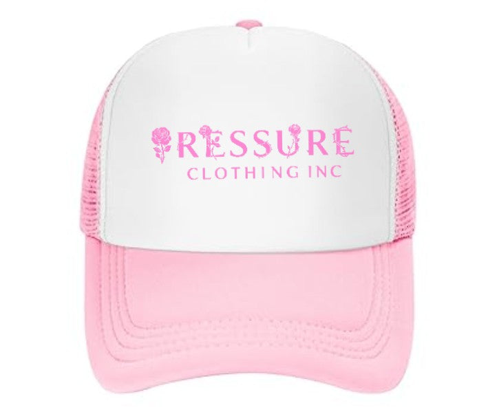 "Check out this stylish trucker hat! It features a crisp white front panel contrasted by a soft pink bill and breathable pink mesh back. The front proudly displays the text 'PRESSURE' in a trendy pink font, with delicate floral accents incorporated into some of the letters. Below that, you'll find 'CLOTHING INC' also in pink. It's a fun and fashionable way to add a pop of color and personality to any outfit!"