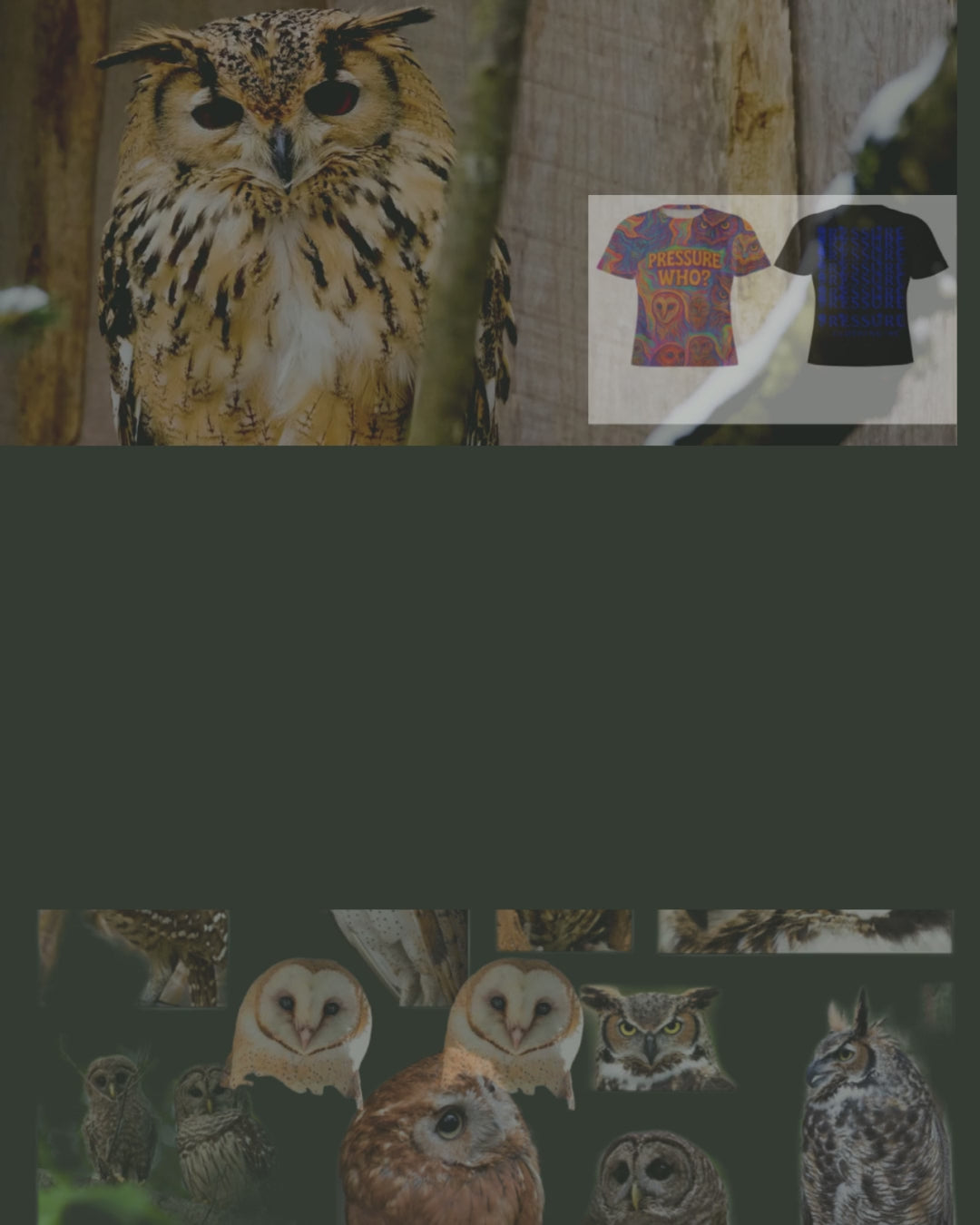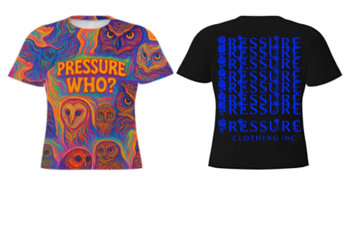 Check out this vibrant, eye-catching t-shirt! The front features a wild, psychedelic swirl of colors with hidden owl faces peeking out from the design. Bold, orange lettering asks "PRESSURE WHO?" making it a real conversation starter.
