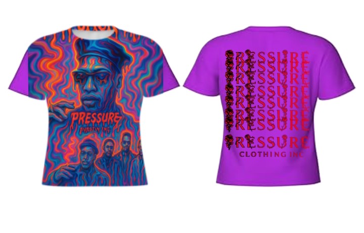 Hey there! Check out this vibrant purple t-shirt. The front features a really cool, almost psychedelic design with portraits of three individuals in shades of blue and orange, overlaid on a swirling background of fiery and cool tones. Below the main portrait, you'll see the words "PRESSURE" and "CLOTHING INC." in a bold, stylized font.