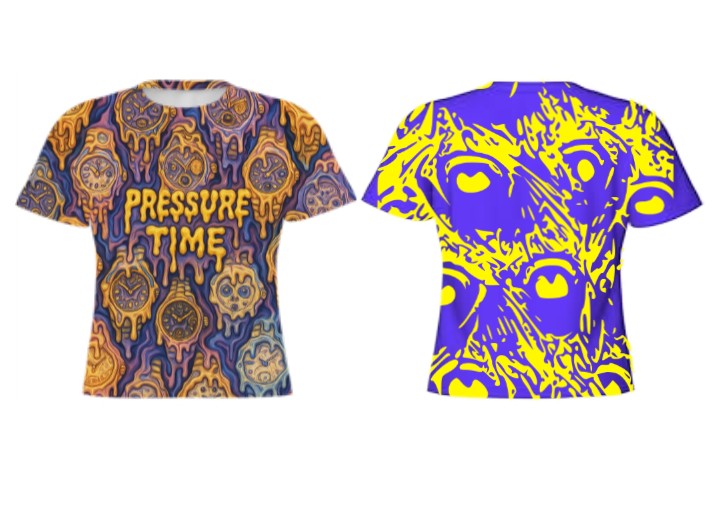 Hey there! Check out this eye-catching t-shirt! The front of this unique piece features a vibrant and surreal design with melting clocks in shades of orange, yellow, and blue, giving off a definite psychedelic vibe. Right in the center, the words "PRESSURE TIME" are boldly displayed in a dripping, groovy font.