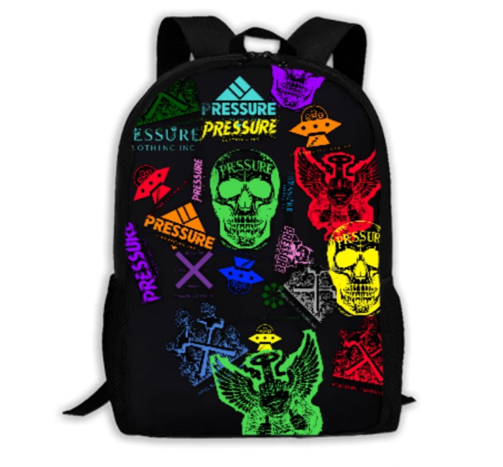 Hey there! Check out this eye-catching backpack! It's a black backpack absolutely covered in vibrant, almost neon-colored designs. You'll see a bunch of cool skulls in different colors like green, purple, and yellow, alongside flying saucers, winged figures, and the word "PRESSURE" repeated in various styles and colors. There's even a big purple "X" adding to the bold look. It's definitely a statement piece that will help you stand out from the crowd!