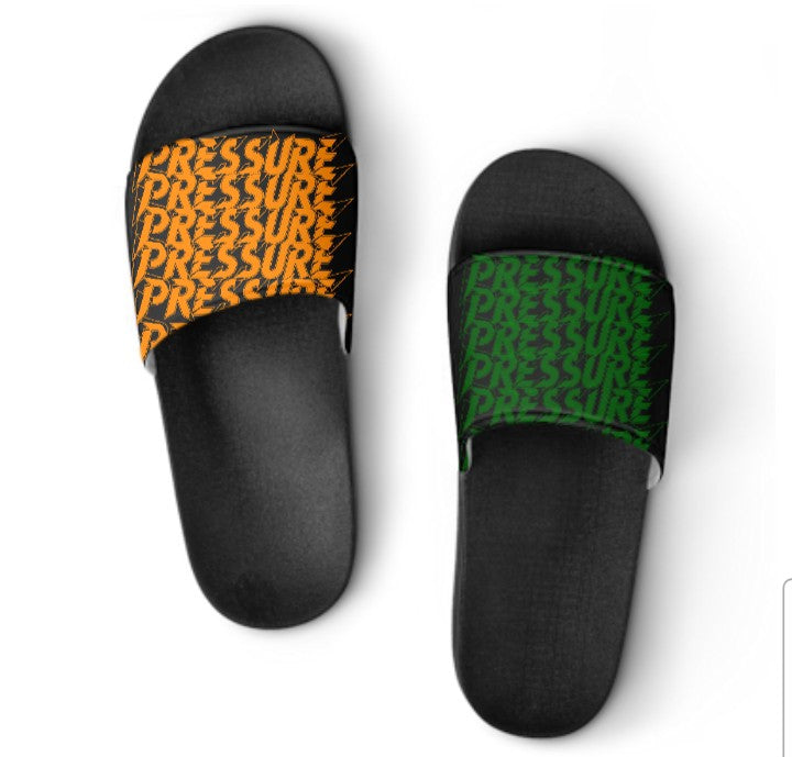 What makes them unique is the repeated "PRESSURE" text printed on the straps. One slide displays the word "PRESSURE" stacked multiple times in a vibrant orange, while the other showcases the same text in a striking green. This contrasting color combination adds a dynamic and eye-catching touch to these easy-to-wear slides. They're a great way to add a pop of color and personality to your everyday look.